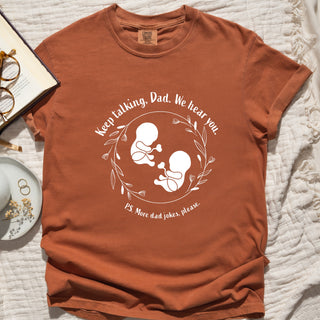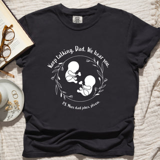 This tee is a love note from the tiniest listeners. Featuring our trademarked Baby Peanut twins nestled inside a wreath of leaves and flowers, itโs a gentle reminder that even before birth, both babyโs already tuning in. With the phrase โKeep talking, Dad. We hear youโ above and โP.S. More dad jokes, please.โ below, this design is perfect for proud papas, expecting families, and anyone who believes bonding starts earlyโand laughter is always welcome.