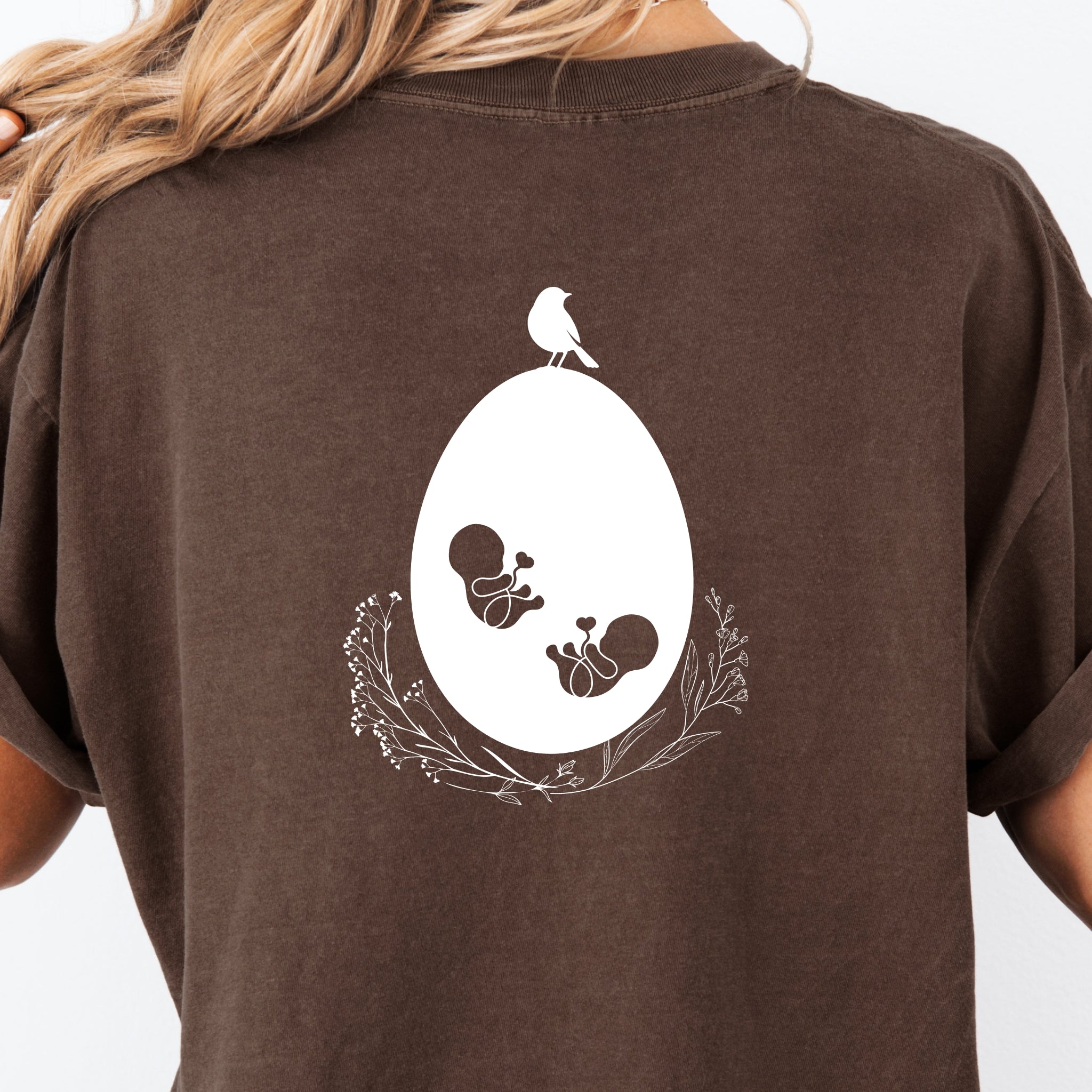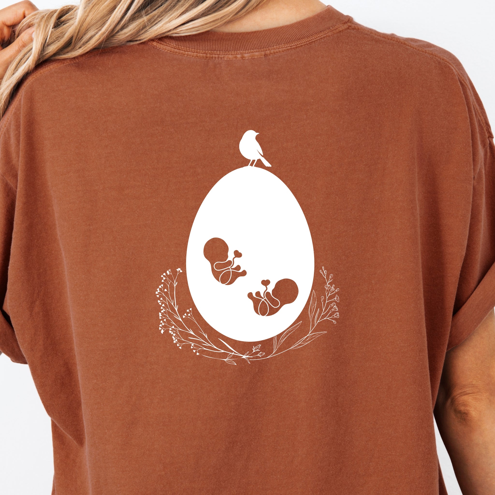 This whimsical tee features our trademarked Baby Peanut twins cozily nestled inside a large egg perched on a bed of wild leafy branches—while a tiny bird stands guard on top, keeping watch like a proud sibling. It’s a sweet celebration of new beginnings, gentle guardianship, and egg-straordinary charm.