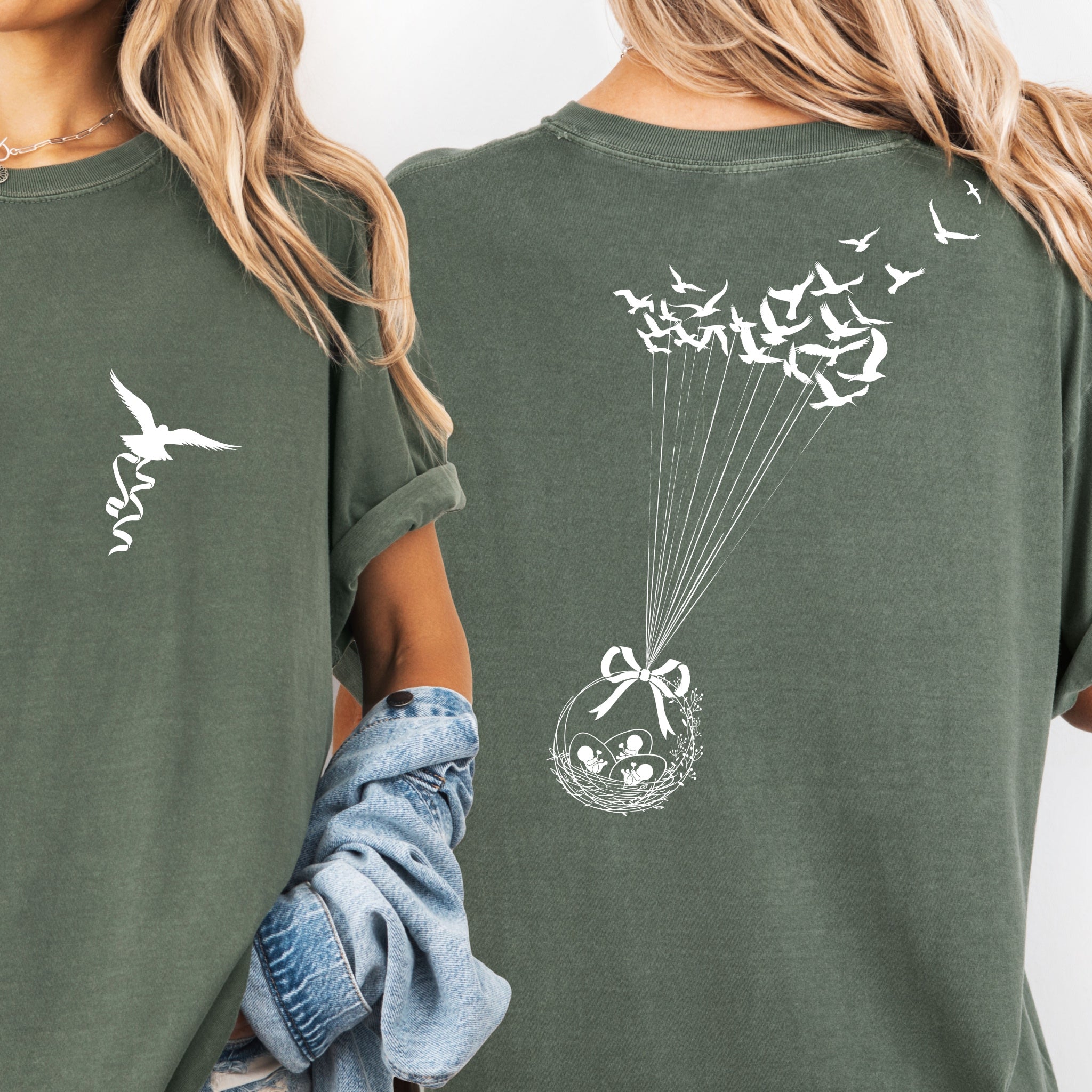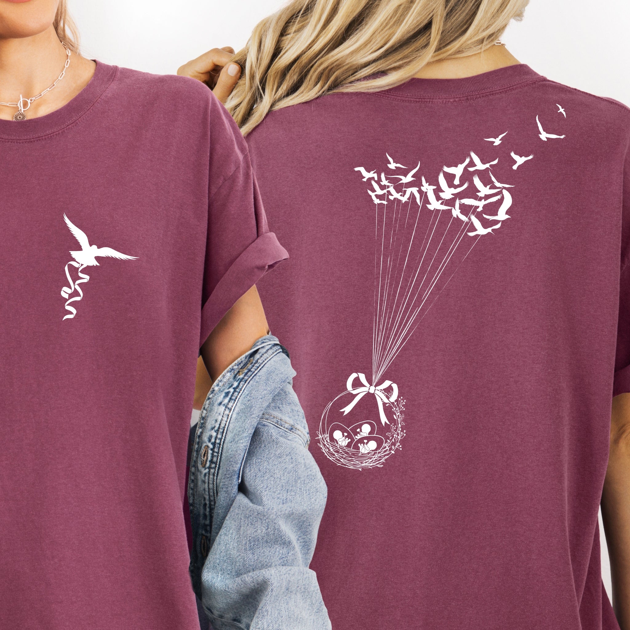 This charming tee features a flock of birds soaring skyward, carrying a basket of eggs nestled among themโwith three special egg cradling our trademarked Baby Peanut. Itโs a sweet symbol of new beginnings, gentle journeys, and the magic of being lovingly carried into the world.