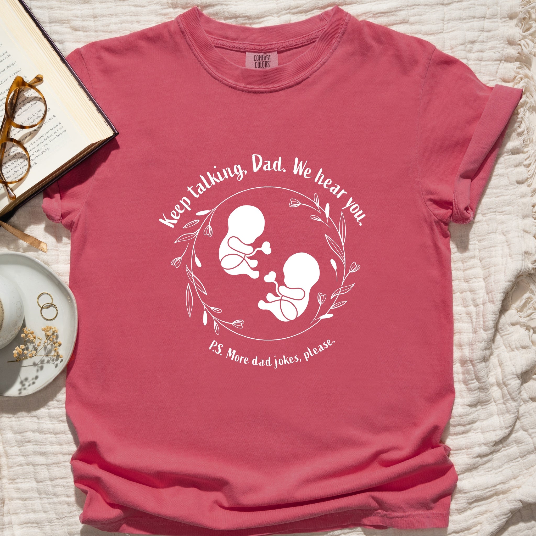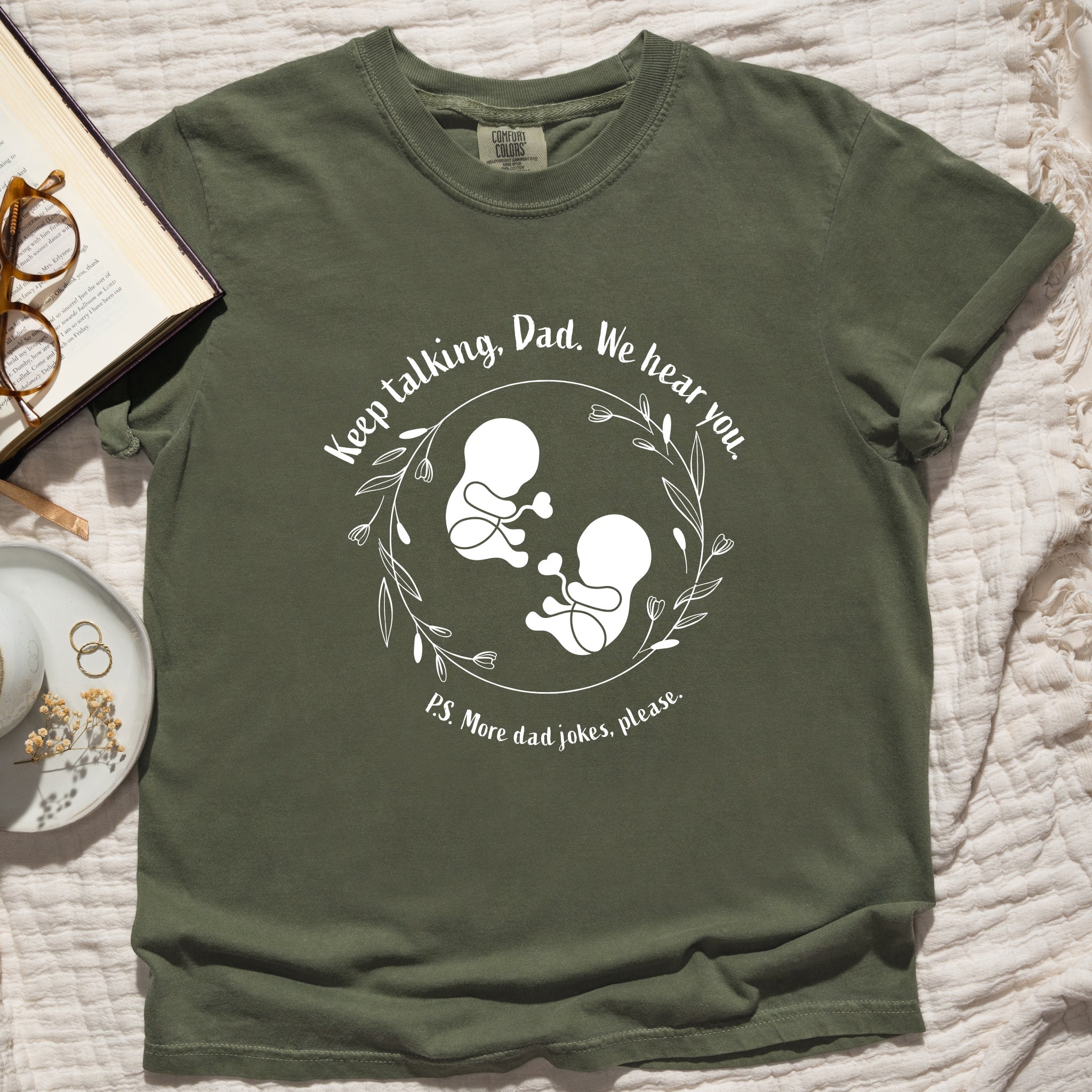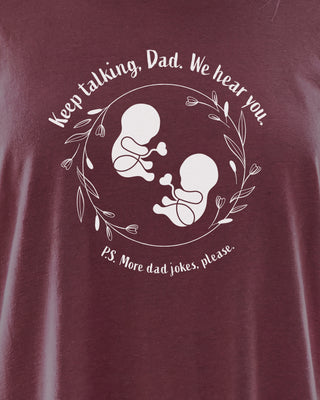 This tee is a love note from the tiniest listeners. Featuring our trademarked Baby Peanut twins nestled inside a wreath of leaves and flowers, itβs a gentle reminder that even before birth, both babyβs already tuning in. With the phrase βKeep talking, Dad. We hear youβ above and βP.S. More dad jokes, please.β below, this design is perfect for proud papas, expecting families, and anyone who believes bonding starts earlyβand laughter is always welcome.
