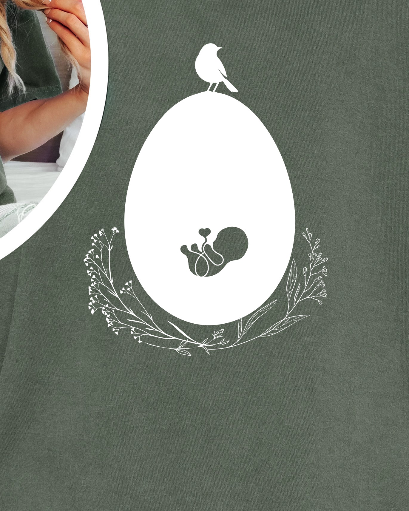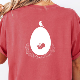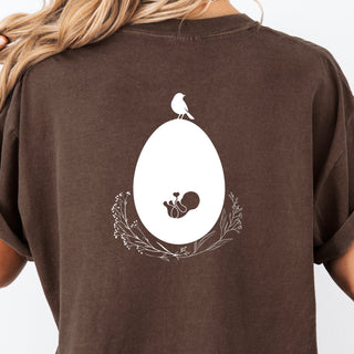 This whimsical tee features our trademarked Baby Peanut cozily nestled inside a large egg perched on a bed of wild leafy branches—while a tiny bird stands guard on top, keeping watch like a proud sibling. It’s a sweet celebration of new beginnings, gentle guardianship, and egg-straordinary charm.